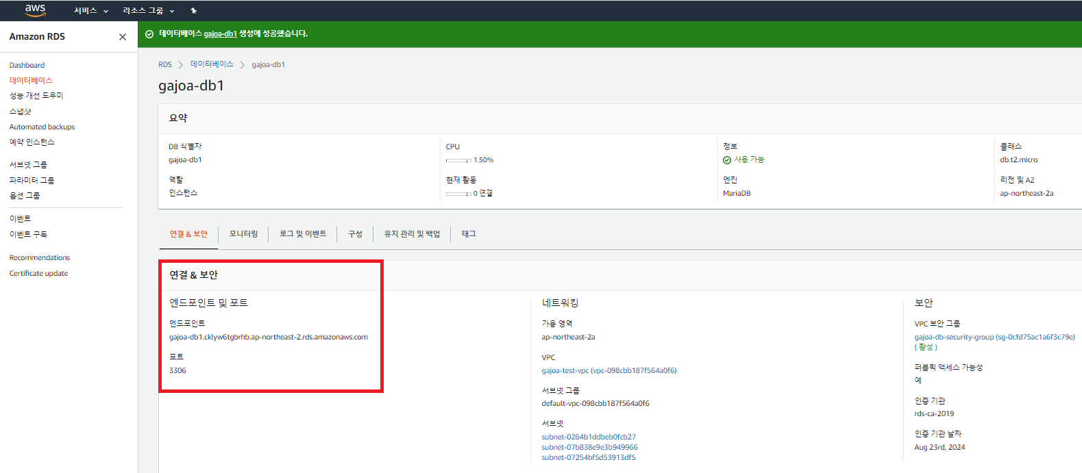 생성된 RDS를 선택하고 들어가면 RDS 상세정보를 확인할 수 있다.