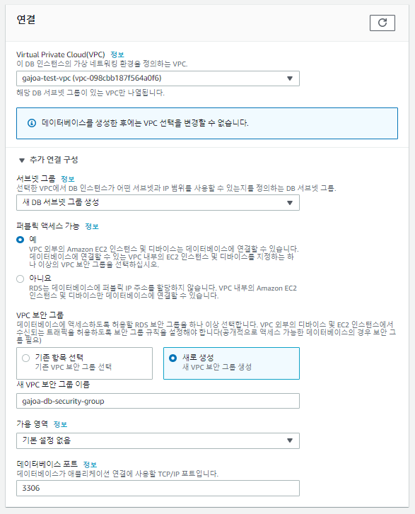 [연결]에서 [Virtual Private Cloud]는 EC2 인스턴스와 동일한 VPC를 셋팅해주고, 퍼블릿 엑세스 가능 여부는 [예]를 선택해서 외부에서 접속 가능하도록 설정한다. [VPC 보안 그룹]은 RDS용으로 신규 보안그룹을 생성해준다. 설정이 완료되었으면 [데이터베이스 생성]을 클릭한다.