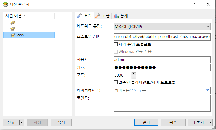 [엔드포인트]에 작성된 [db명].[임의문자].[리전].rds.amazonaws.com이 호스트명이고 포트는 3306이다.