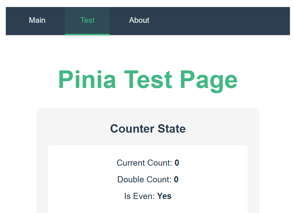 main 페이지 현재 main 페이지, test 페이지에는 pinia 테스트 페이지