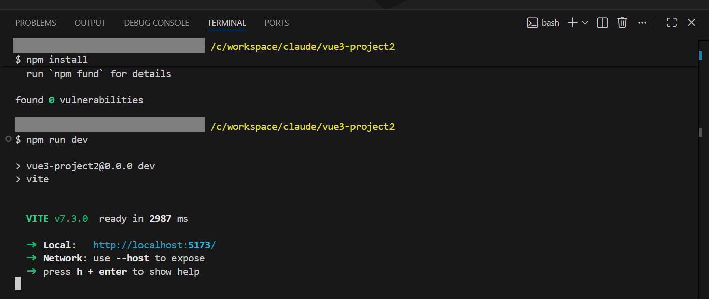 Claude Code가 알려준 대로 아래 2가지 명령어를 프로젝트 디렉토리에서 git-bash를 통해 수행하면 생성된 vue 프로젝트가 수행됩니다.