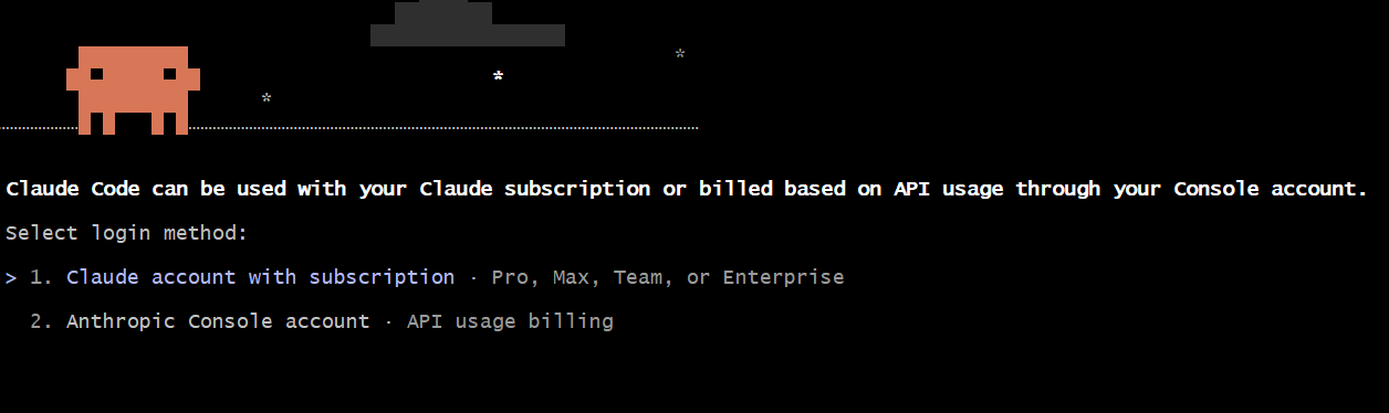 다음으로 요금제를 선택합니다. Pro / Max 요금제를 사용할 경우는 1번을, 그렇지 않고 API 요금제를 사용할 경우 2번을 선택합니다. 이 글은 Pro 요금제 기준으로 작성했기 때문에 1을 선택했습니다.