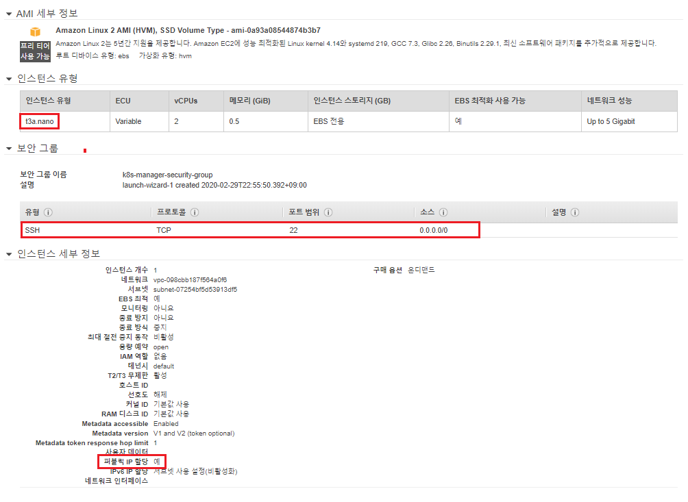 로컬PC에서 쿠버네티스 설치 및 관리를 진행해도 되지만, 그렇게 되면 쿠버네티스를 여러 장비에서 관리하게 될 경우 각 장비들마다 AWS CLI를 설치해야하고, 해당 장비들에서 접속을 직접하기 때문에 보안상으로도 문제가 있을 수 있다. 따라서 필자는 쿠버네티스 설치를 진행하고 관리를 할 EC2 인스턴스를 생성하였다. 하지만 해당 EC2 인스턴스 내에 쿠버네티스 클러스터가 생성되는건 아니기 때문에 높은 사양의 인스턴스는 필요없어서 t3a.nano로 생성하였다.