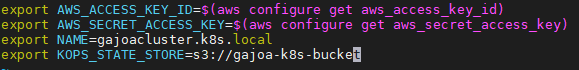 다음으로 KOPS를 설치할 때 필요한 환경변수를 ~/.bash_profile에 작성하고 ~/.bash_profile을 적용한다. NAME 변수에는 쿠버네티스 클러스터 이름을 넣는데, Gossip 기반의 클러스터를 사용할 것이기 때문에 클러스터 이름은 .k8s.local로 끝나야 한다. Gossip 기반의 클러스터를 사용하게 되면 별도의 외부 도메인 등록 없이 클러스터를 생성할 수 있다.