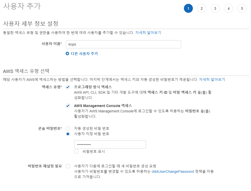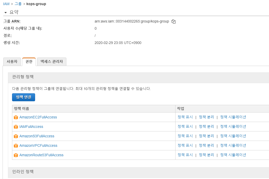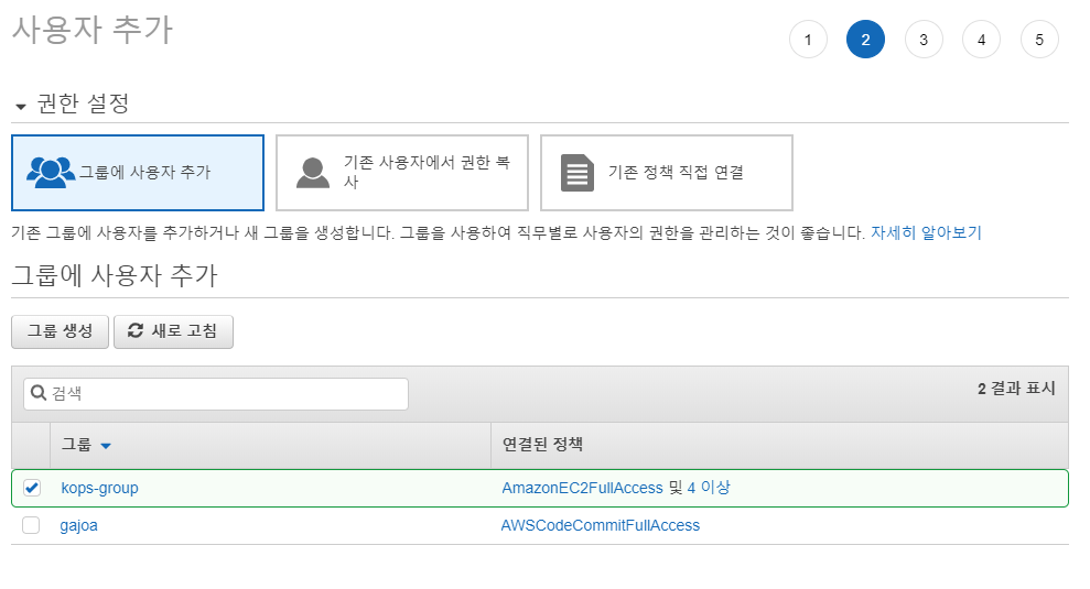 따라서 5개의 권한을 가진 IAM 계정을 만들어야 한다. 필자는 계정을 직접 만들진 않고 5개의 권한을 가진 그룹을 만든 후 해당 그룹에 계정을 포함시켰다(IAM 계정명 kops, IAM 그룹명 kops-group)