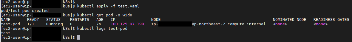 그리고 pod 목록 및 로그를 확인해보면 해당 yaml파일이 정상적으로 올라간 것을 확인할 수 있다. 성공!!!