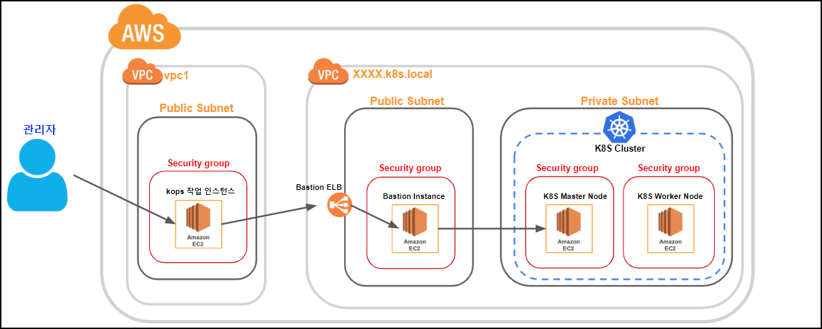 마지막으로 쿠버네티스 클러스터가 구축된 AWS 구성도를 그려보면 아래와 같다.