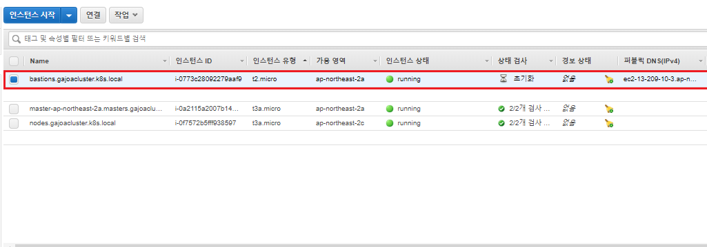 그러고 [AWS Management Console] -> [EC2]로 가보면 바스티온 인스턴스가 생성된 것을 확인할 수 있다.