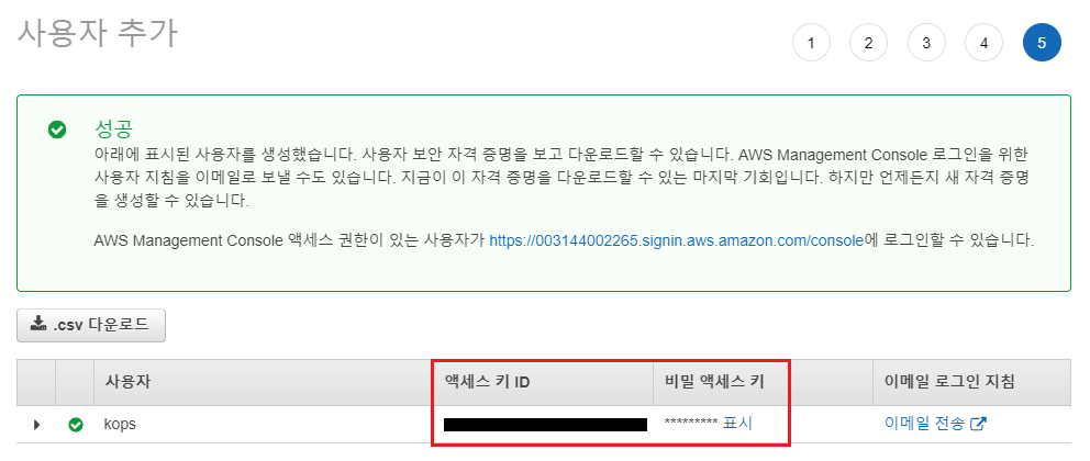 계정이 생성되면 엑세스키ID와 비밀 엑세스키는 꼭 기억해두도록 하자(EC2 인스턴스에서 kops를 설치하기 위해 해당 계정으로 접속할 때 쓰인다).