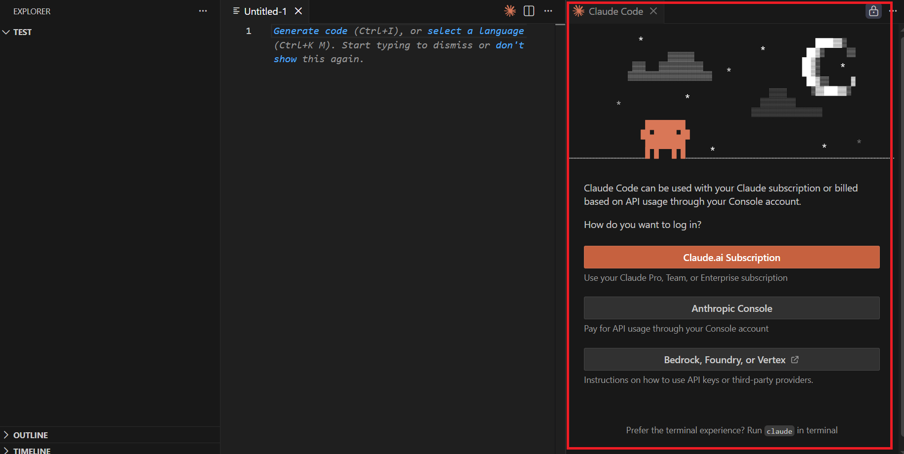 1-3) 그러면 다음과 같이 Claude Code Tab 이 Open되면서 Claude Code 인증이 필요하다고 나옵니다. "Claude.ai Subscription" 버튼을 클릭해줍니다.