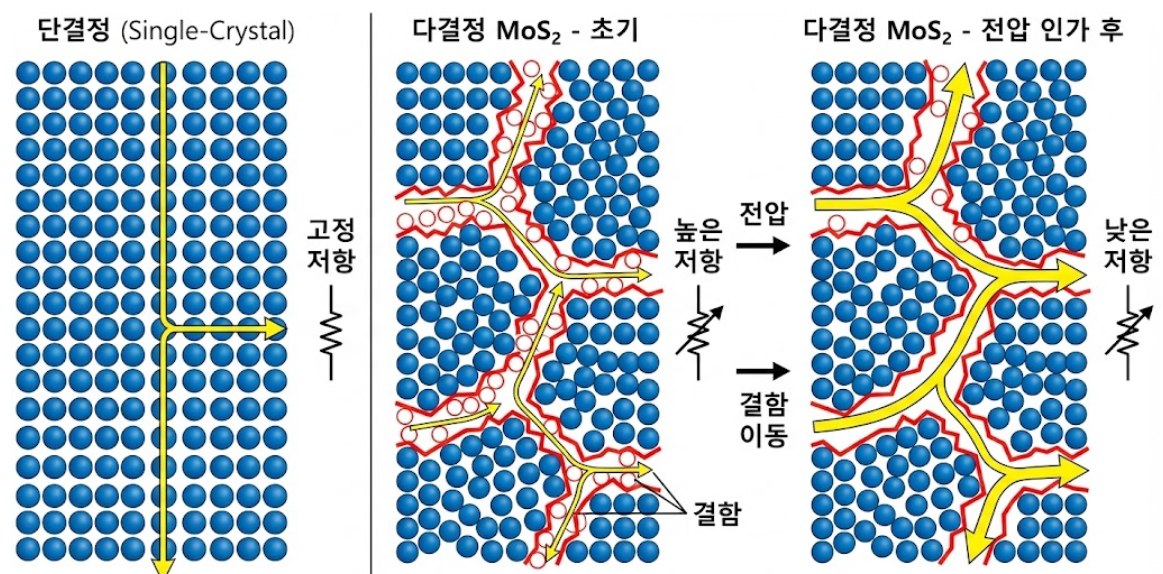 MoS2 박막 내부의 결정립계(Grain Boundary)에는 원자가 비어있는 결함들이 존재합니다. 전압을 걸어주면 이 결함들이 이동하면서 전기가 흐르는 길을 넓히거나 좁힙니다. 이것이 바로 저항이 변하는(메모리) 원리입니다.