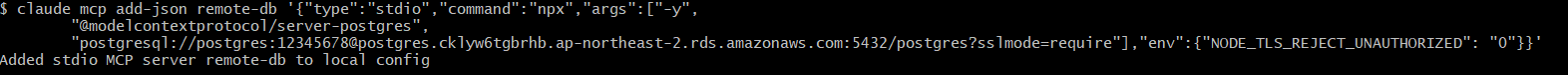 claude mcp add-json remote-db '{"type":"stdio","command":"npx","args":["-y", "@modelcontextprotocol/server-postgres", "postgresql://postgres:12345678@postgres.cklyw6tgbrhb.ap-northeast-2.rds.amazonaws.com:5432/postgres?sslmode=require"],"env":{"NODE_TLS_REJECT_UNAUTHORIZED": "0"}}'