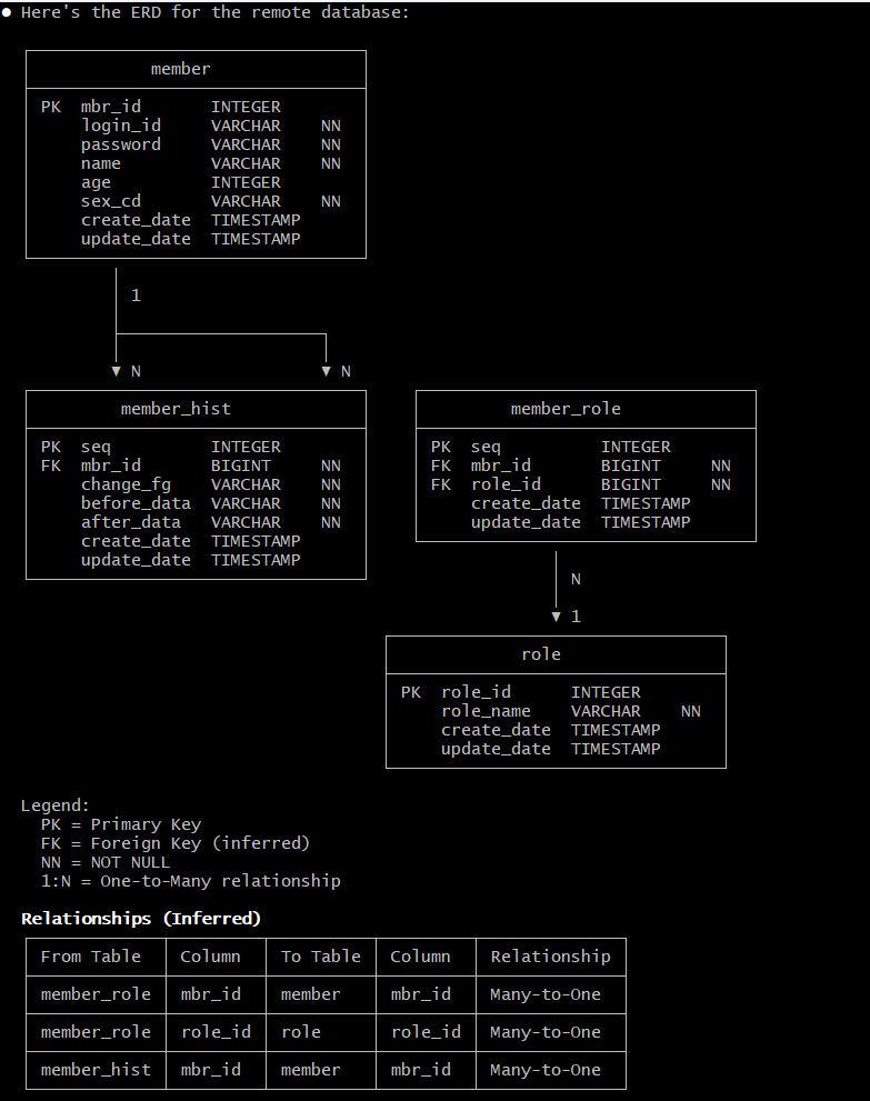 질의 결과 정상적으로 원격 DB의 ERD가 조회되는 걸 확인할 수 있습니다. 성공!