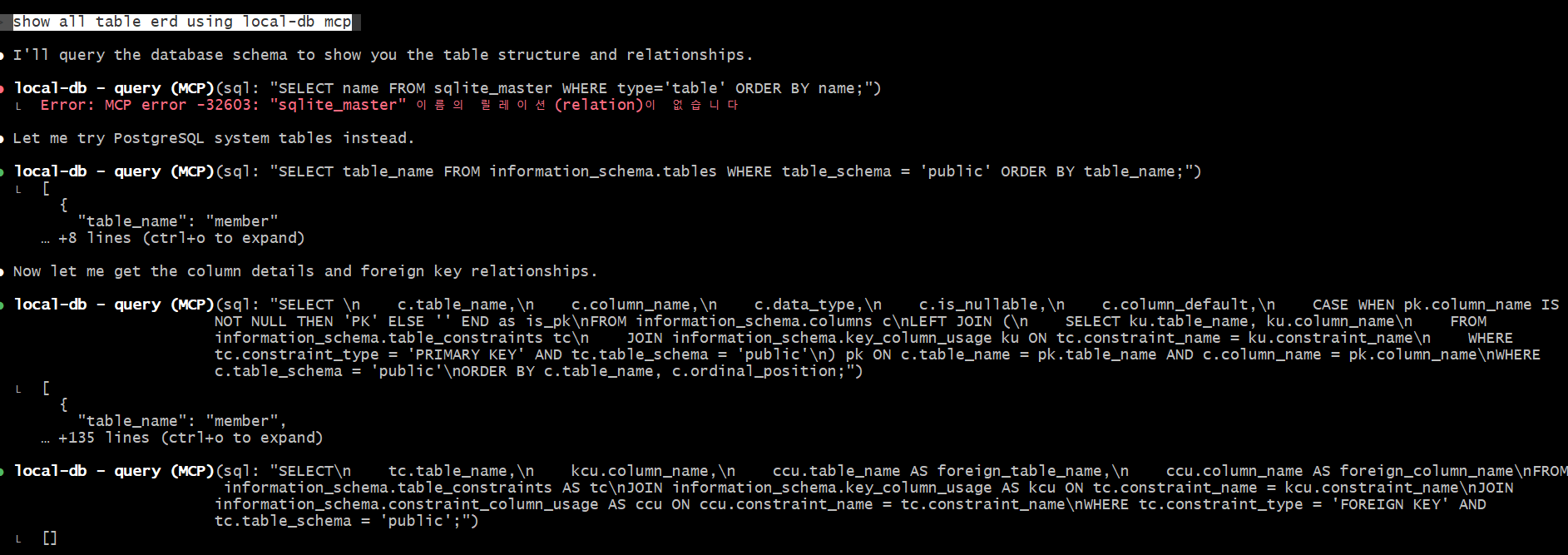 우선 Claude Code CLI 치신 후 Local DB의 ERD를 조회한 것처럼 질의를 해보겠습니다.