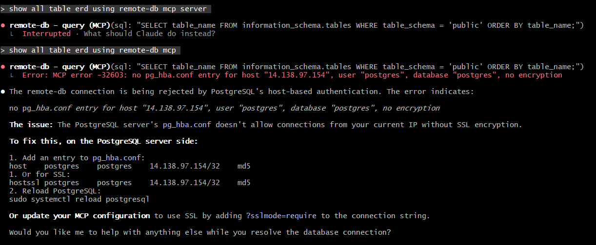 claude mcp add --transport stdio remote-db -- npx -y @modelcontextprotocol/server-postgres "postgresql://postgres:12345678@postgres.cklyw6tgbrhb.ap-northeast-2.rds.amazonaws.com:5432/postgres"