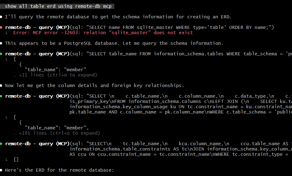 이제 MCP를 활용하여 원격 DB ERD를 확인해 보겠습니다.