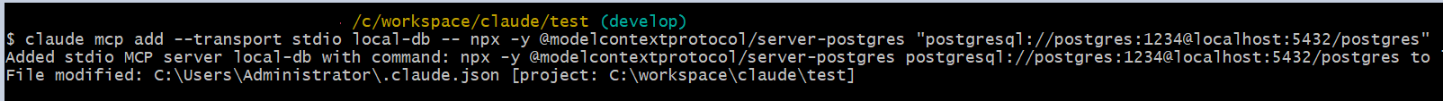 claude mcp add --transport stdio local-db -- npx -y @modelcontextprotocol/server-postgres "postgresql://postgres:1234@localhost:5432/postgres"