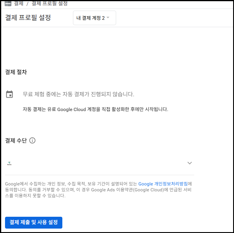 결제 계정을 우선 등록해줘야 합니다. "결제 계정 관리" 클릭 후 "계정 만들기" 를 클릭합니다.