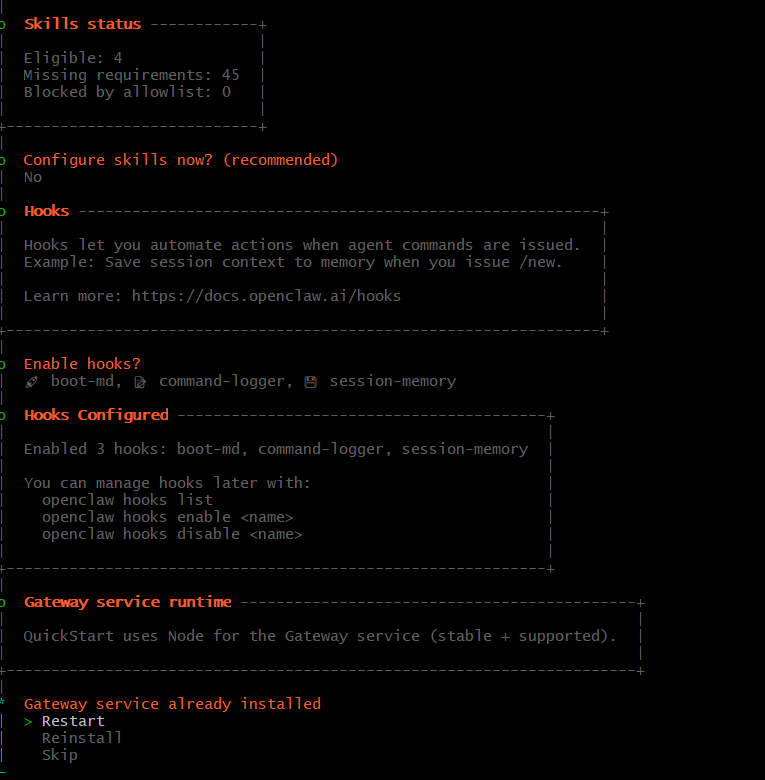 그 외에 설정은 설치 때와 동일하게 해주고, 마지막은 오픈클로 'Restart'로 마무리 해줍니다.