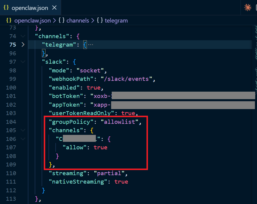 위에서 채번한 Slack 채널 ID를 설정파일(~/.openclaw./openclaw.json) 파일에 다음과 같이 추가해주면 됩니다(groupPolicy가 allowlist일 때, slack.channels 에 Slack 채널 ID를 넣어주면 됩니다)