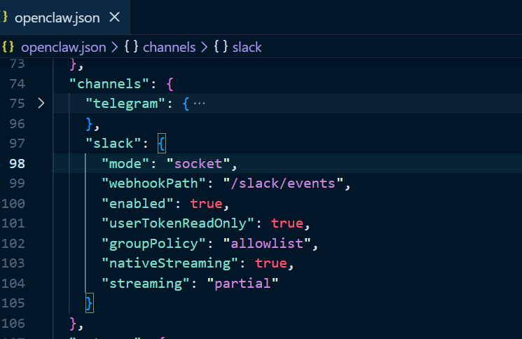 또한 Slack 플러그인이 Loaded 되면서 ~/.openclaw/openclaw.json 설정 파일의 channels 항목에 Slack에 대한 설정이 들어간 것을 확인할 수 있습니다(groupPolicy가 allowlist인지도 확인합니다)
