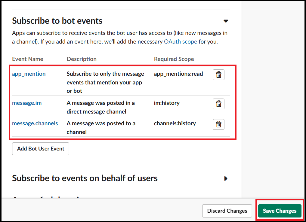 - im:history : Event Subscription 에서 추가됨. Slack App이 추가된 다이렉트 메시지에서 메시지와 다른 콘텐츠 보기