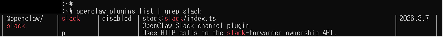 다음으로 오픈클로 플러그인 리스트에서 Slack을 검색합니다. 보시면 Slack 플러그인이 비활성화(disabled) 되어 있는 걸 확인할 수 있습니다.