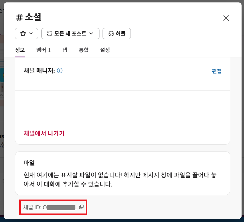 Slack 채널 ID는 Slack 채널 URL 맨 뒤 C로 시작하는 문자열이 채널 ID입니다. 혹은 채널명 우클릭-> 채널 세부정보 보기에서도 확인할 수 있습니다.