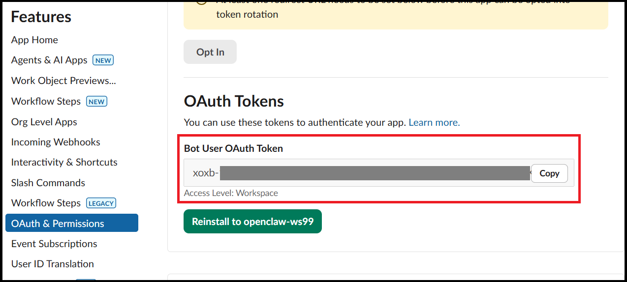 토큰값은 추후에 오픈클로와 Slack App 연결을 위한 설정에 넣어야 하기 때문에 복사해 둡니다.