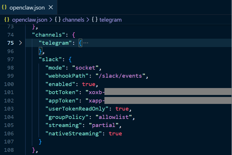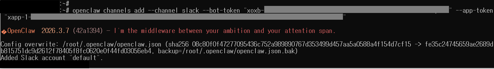 이제 오픈클로 설정에 Slack 채널 정보를 설정해 주겠습니다. Slack 채널 정보 등록 명령어를 입력하면(조금 전 복사한 봇 토큰(xoxb-...) 과 앱 토큰(xapp-....) 이 필요), 오픈클로 설정파일(~/.openclaw/openclaw.json)에도 봇 토큰과 앱 토큰 정보가 설정됩니다.