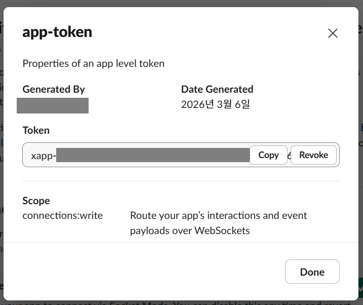그럼 다음과 같이 앱 토큰이 "xapp-"이라는 prefix가 붙어서 생성됩니다.