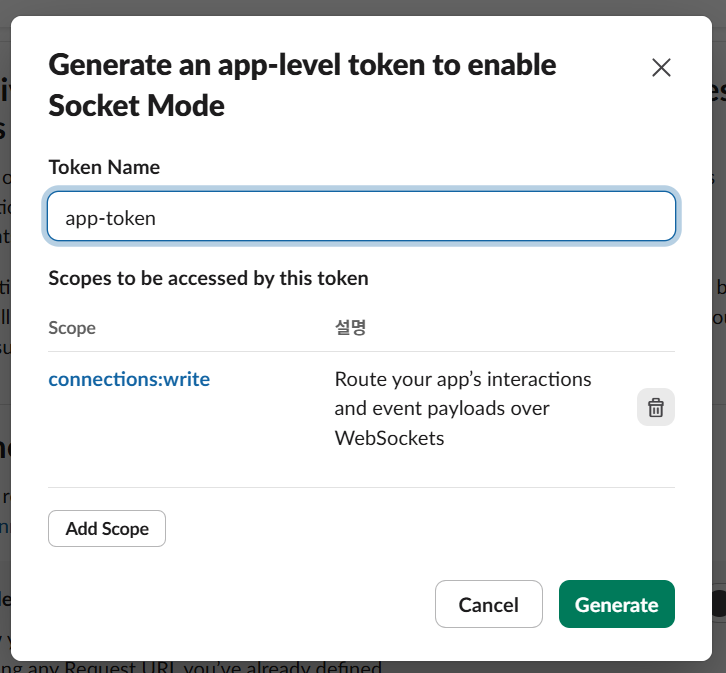그러면 App Token (이하 앱 토큰) 생성 창이 나오는데, App level token 이름을 입력하고 Scope가 "connections:write"가 있는지 확인하고 생성해줍니다.