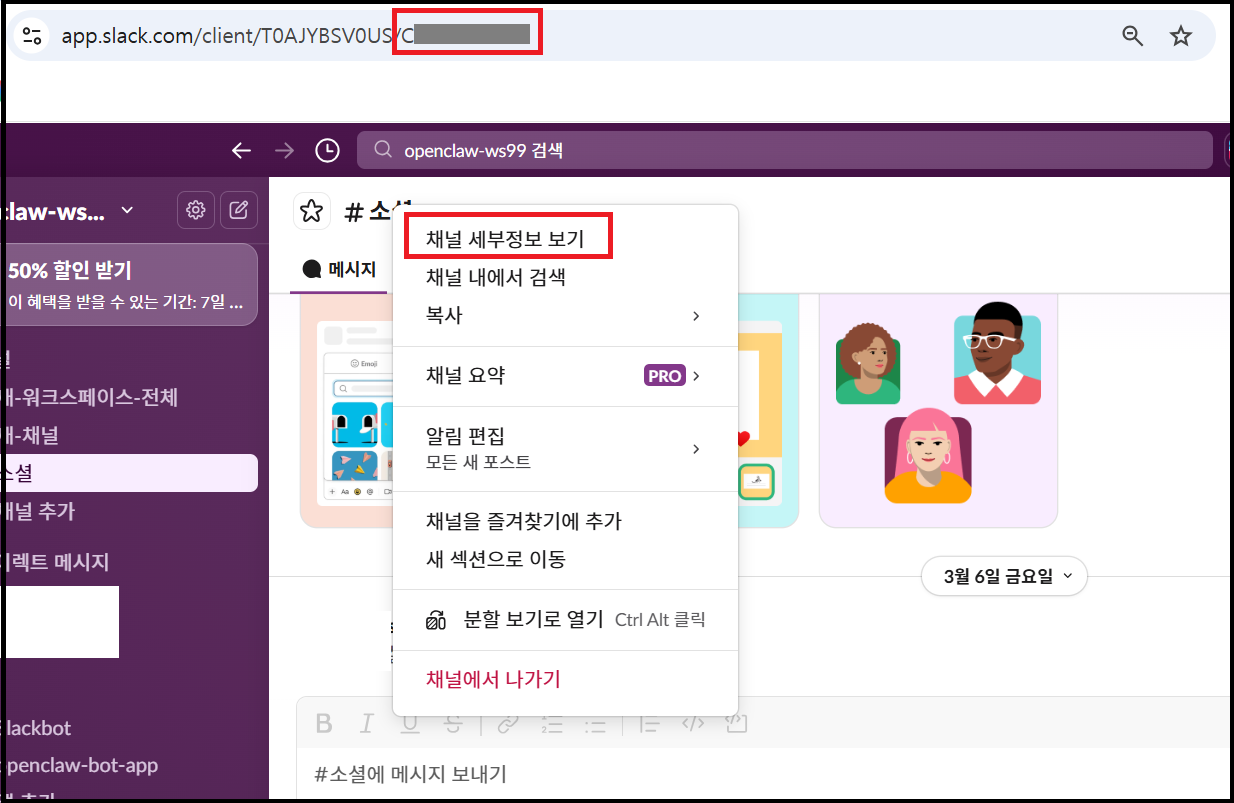다음으로 오픈클로 봇이 접근할 수 있는 Slack 채널 ID를 채번해줍니다.
