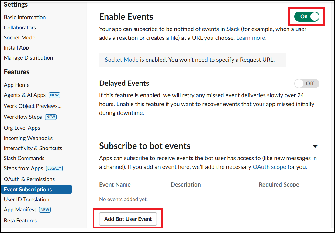 좌측 사이드바 Features -> Event Subscriptions -> Enable Events 를 ON으로 변경합니다.