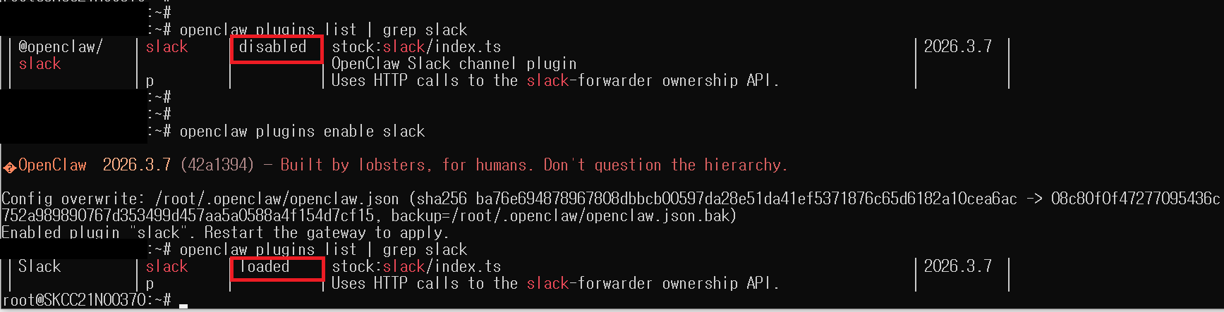 비활성화 되어있는 Slack 플러그인을 활성화 시킵니다. 활성화 완료 후 플러그인을 다시 확인해 보면, disabled -> loaded 로 변경된 것을 확인할 수 있습니다.