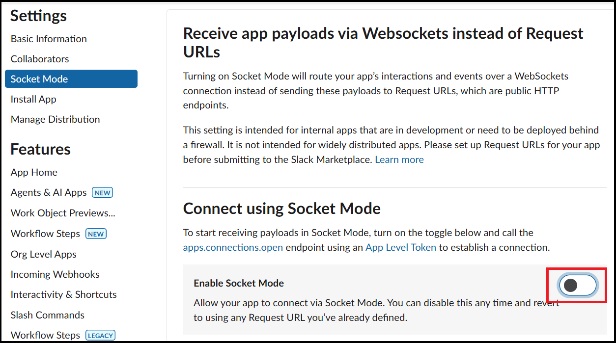 좌측 사이드바 Settings -> Socket Mode -> Enable Socket Mode 를 활성화 시킵니다.