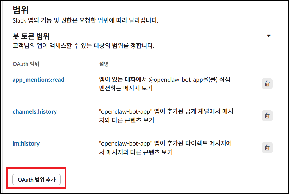 이번 실습에 등록한 Slack App(오픈클로)의 권한은 아래 빨간색 글씨이고, 권한을 더 추가하시면 좀 더 다양한 기능을 활용할 수 있습니다.