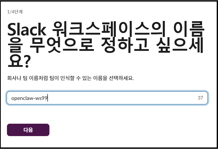 우선 오픈클로 봇과 대화할 Slack Workspace(이하 슬랙 워크스페이스)를 생성하겠습니다.
