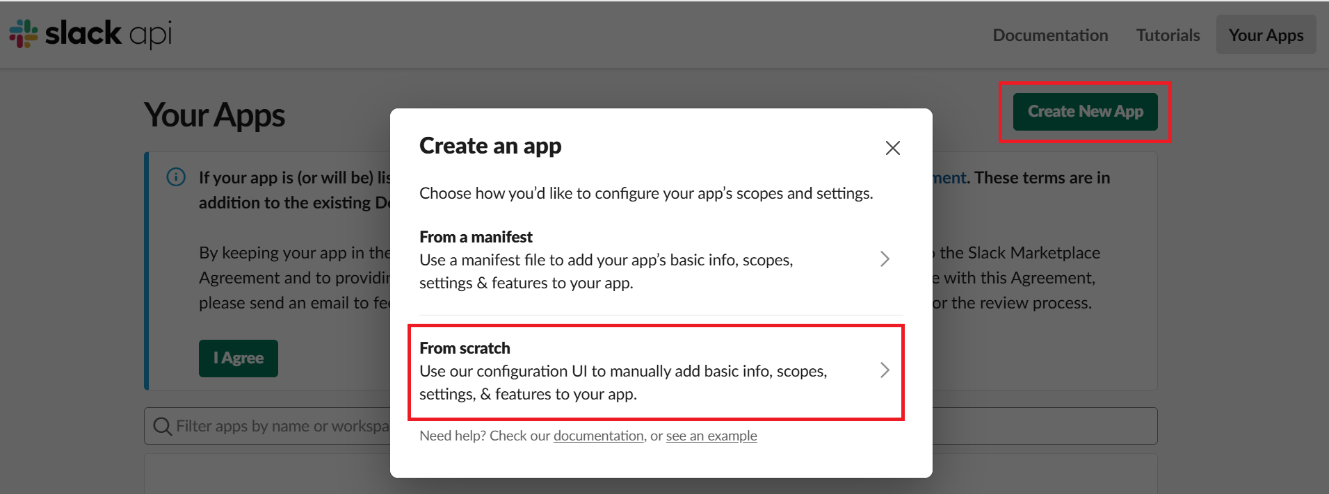 https://api.slack.com/apps/ 로 이동 후 우측 상단 "Create New App" 클릭 -> 처음부터 구성하는 "From scratch" 선택