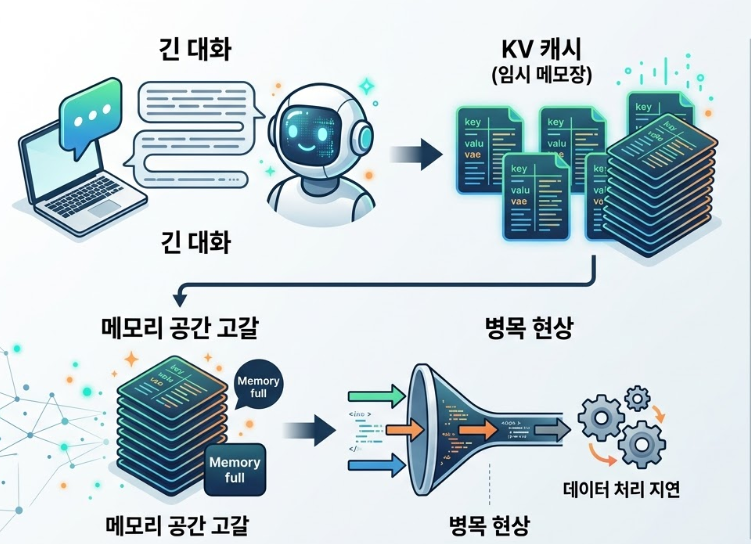 인공지능 모델은 사용자와 길게 대화를 나누며 문맥을 유지하기 위해 '키-값 캐시(KV 캐시)'라는 임시 메모장을 필수적으로 사용합니다. 문맥이 길어지고 복잡해질수록 이 임시 메모장이 순식간에 가득 차게 됩니다.