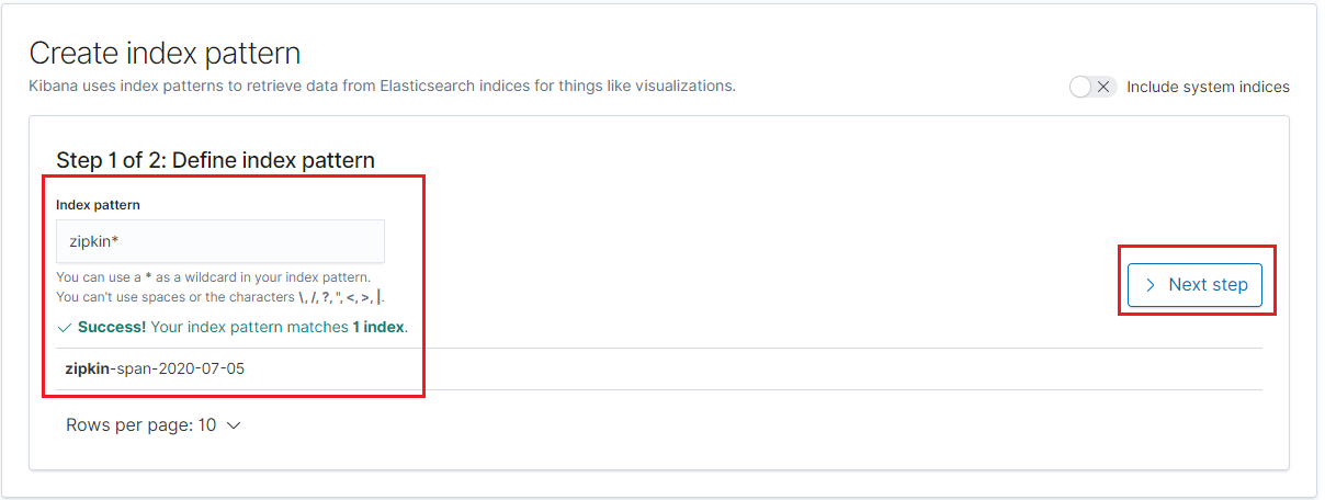 [Create Index Pattern]에서 zipkin* 으로 검색한 후 [Next step]을 누른다.
