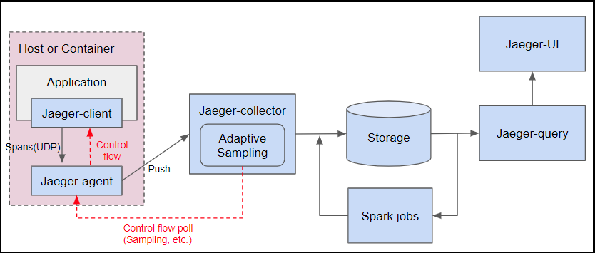 2. Agent : UDP를 통해 전송 된 Span 수신을 대기하는 네트워크 데몬으로 일괄 처리하여 Collector로 전송한다. Agent는 Jaeger 적용 서비스가 존재하는 모든 호스트에 배포되어야 한다.