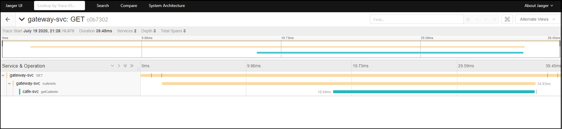 설정이 완료되었으면 3개의 서비스를 실행시킨 후, Gateway를 통해서 서비스를 호출한 후(예를 들면 GET localhost:8080/cafe/info), 다시 Jaeger UI로 접속해보자([Jaeger 설치 서버 IP]:16686).
