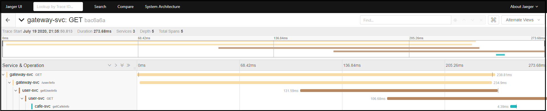 그리고 localhost:8080/user/info 서비스를 호출한 후 jaeger UI를 확인해보면, 아래 그림과 같이 게이트웨이에서 2개의 서비스가 순차적으로 호출되는 것을 확인할 수 있다.