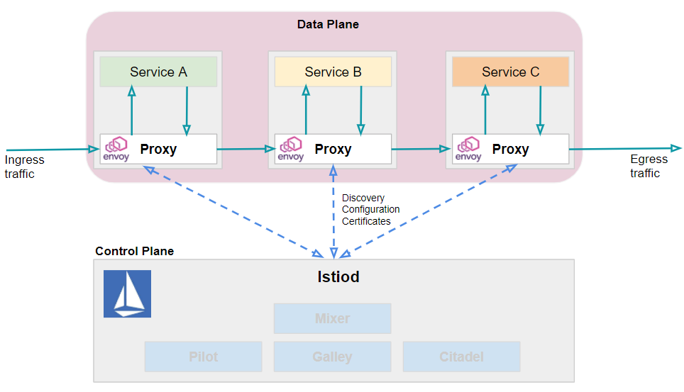 다음으로 istio1.5 이상 버전에서 제공하는 통합 컨트롤 플레인인 istiod는 서비스 디스커버리(Service Discovery), 설정 관리(Configuration Management), 인증 관리(Certificate Management) 등을 수행한다.